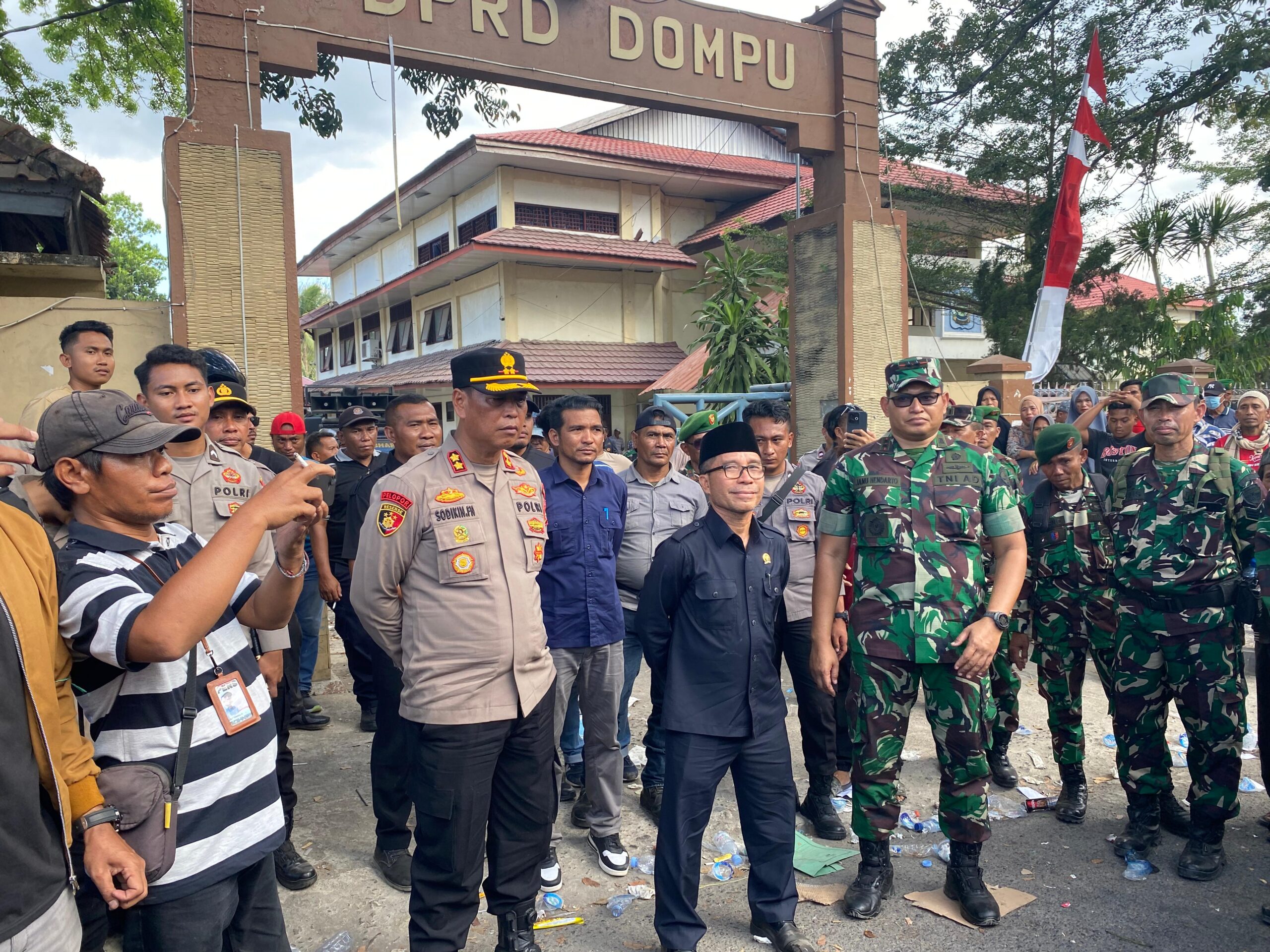 Sekitar pukul 13.30 WITA, massa aksi berdialog langsung dengan Forkopimda Kabupaten Dompu, yang terdiri dari Bupati Bambang Firdaus, Ketua DPRD Ir. Muttakun, Kapolres Dompu, dan Dandim 1614. Dialog dilakukan secara terbuka di depan gerbang DPRD dan membahas secara detail tuntutan dari massa.