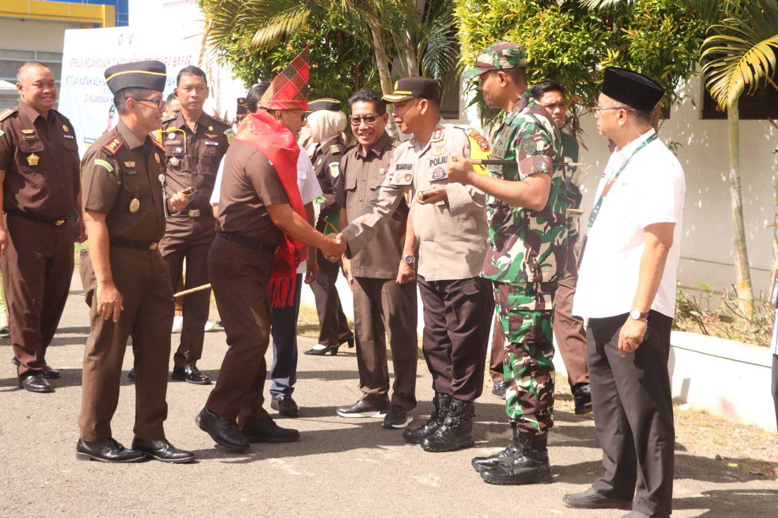 Kedatangan Kajati NTB disambut hangat oleh Kapolres bersama Forkopimda dan pejabat Kejaksaan. Suasana penyambutan berlangsung penuh keakraban, terlihat dari rangkaian salam dan dialog antara Kapolres, pejabat TNI–Polri, serta unsur pemerintah daerah yang hadir.
