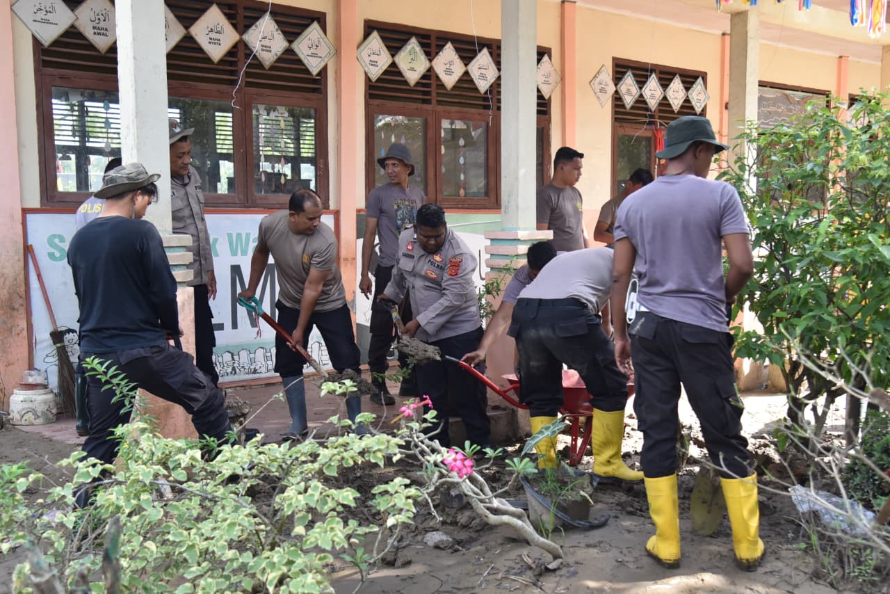 Bireuen — Kepolisian Resor Bireuen bersama jajaran Polsek melaksanakan gotong royong pemulihan pascabencana banjir bandang di SD Negeri 11 Kutablang, Desa Keurumbok, Kecamatan Kutablang, Kabupaten Bireuen, Minggu (18/1/2026).